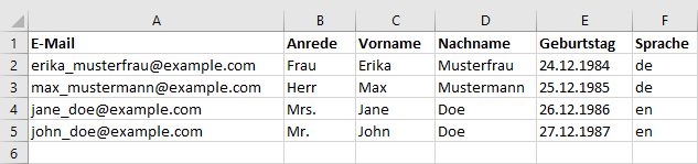 Abonnenten: ImportWahrscheinlich haben Sie bereits eine Liste von Adressen zusammengestellt, die Sie per Newsletter anschreiben möchten. Über das universelle CSV-Dateiformat lassen sich Ihre Adressen aus nahezu jeder Datenbank oder Tabellenkalkulation (z. B. Microsoft Office oder Open Office) exportieren und anschließend in Smartmail importieren. Um die Zuordnung der Spalten (z. B. Vorname, Nachname, E-Mail) beim Import zu erleichtern, sollte die erste Zeile Ihrer CSV-Datei aussagekräftige Spaltenüberschriftten enthalten. Ein Beispiel: