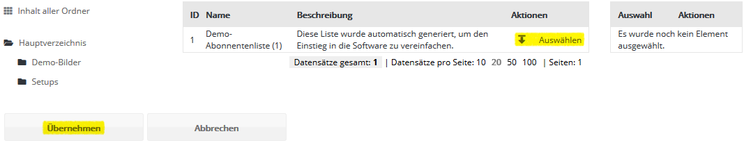 Schritt 3 - AbonnentenlistenWählen Sie nun aus, in welche Smartmail Abonnentenliste ihre CSV-Datei importiert werden soll. Falls Sie zuvor keine eigene Abonnentenliste in Smartmail angelegt haben (siehe Menü Abonnentenlisten), steht zum schnellen Einstieg die leere Abonnentenliste 'Demo-Liste' bereit. Diese Liste wird in der Regel bei der Einrichtung Ihres Smartmail Kontos angelegt und zur Demonstration mit einem Beispiel-Abonnenten befüllt.