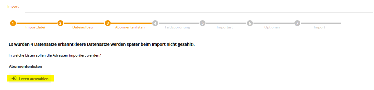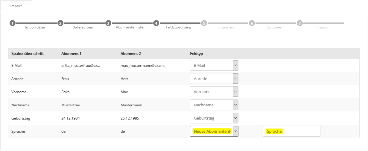 Auch die Auswahl mehrerer Abonnentenlisten ist möglich, falls Sie parallel in mehrere Listen importieren möchten. Klicken Sie nach Auswahl der gewünschten Liste(n) auf 'Übernehmen' und anschließend auf 'Weiter'. Der Name einer Abonnentenliste lässt sich im Menü Abonnentenlisten auch nachträglich jederzeit ändern. Schritt 4 - FeldzuordnungIn Schritt 4 teilen Sie Smartmail mit, welche Spalte (z.B. Vorname, Nachname) Ihrer CSV-Datei in welches Smartmail Abonnentenfeld importiert werden soll. Zum schnellen Einstieg sind typische Abonnentenfelder wie 'E-Mail', 'Anrede', 'Vorname' und 'Nachname' in Smartmail bereits vorhanden.