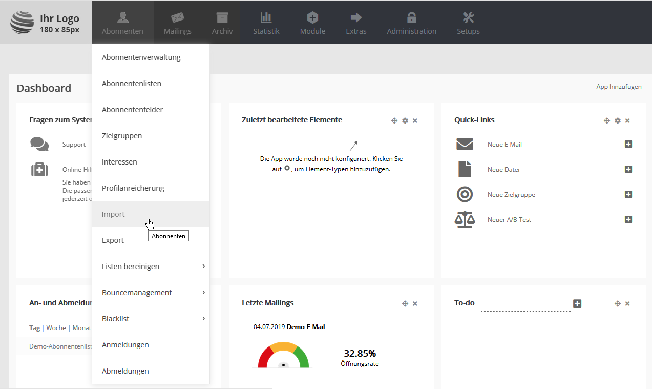Zum Abspeichern Ihrer Daten wählen Sie bitte je nach Version Ihres Office-Paketes das Exportformat CSV UTF8 (Trennzeichen-getrennt) oder CSV (Trennzeichen-getrennt). Import Schritt für Schritt erklärtUm Ihre CSV-Datei in Smartmail zu importieren, wählen Sie im Menü 'Abonnenten' den Punkt 'Import':
