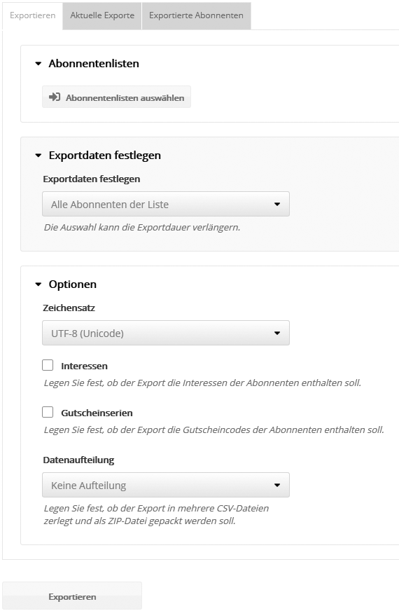 Abonnenten: ExportAbonnentenlisten lassen sich aus Smartmail als CSV-Dateien exportieren. Damit können Sie lokale Backups Ihrer Abonnentenlisten anlegen oder den Inhalt bearbeiten und anschließend per Import-Methode 'Aktualisieren' erneut importieren.