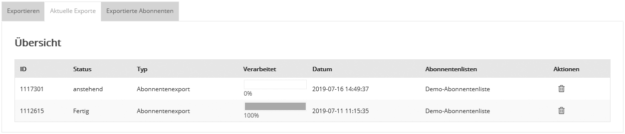 Durch Klick auf die Schaltfläche 'Exportieren' startet Smartmail den Export und wechselt zu 'Aktuelle Exporte'. Hier sehen Sie den Fortschritt des aktuellen Exports. Dem Verlaufsbalken sowie dem jeweils angezeigten Status entnehmen Sie, wann der Export erfolgreich abgeschlossen ist. Im Reiter 'Exportierte Abonnenten' finden sie die Export-Datei, die Sie nach einem Klick auf 'Download' auf Ihrem Computer speichern können.