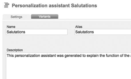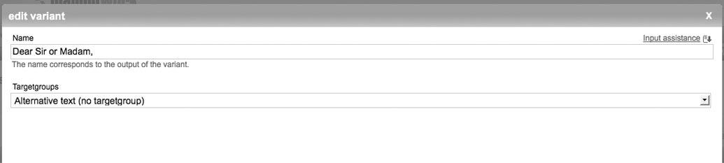 Tab VariantsHere you enter detailed definitions of your personalizations. Click 'create variants' to open a new tab, where you can enter your wanted settings. Create your title by using the 'input assictance' into the name-field. Take a look at our example 'Hello [Vorname]': |