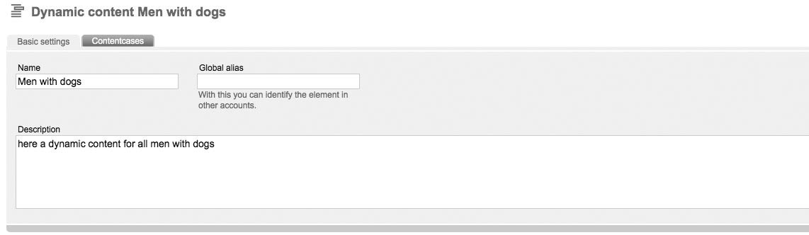 What is a dynamic content?With the help of dynamic contents, you can specialize a landingpage to a specific targetgroup or a single subscriber. Those contents, which you've still defined for a specific targetgroup or a single subscriber, are visible just for relevant subscribers. Let's take a look at an example: Through a survey you got specific information about your subscribers. You can divide your subscribers in female or male. Also you've got a link in your database, whose subscribers are animal owners or not.In a new mailing to all animal owners, only men with an animal should see a specific dynamic content. Create a dynamic contentClick 'create new dynamic content' and a new tab will open. Set your wanted settings. |