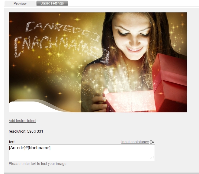 Draw up a test subscriber in tab 'test' -> 'preview', with whom you want to test your personalizing text. After testing your motive through a 'test sending' or just in the mailing, you can switch back to 'image generation'. Through tab 'Progress' you can start your image generation with a click on 'Start generation'.