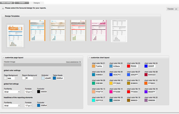 Now you also can adjust the design of your report. Choose the tab 'designs'. By default Smartmail suggests you six different layouts. HTML experts can also open the 'advanced settings' below the layouts to edit the html-code. For example you can insert your logo in th header.