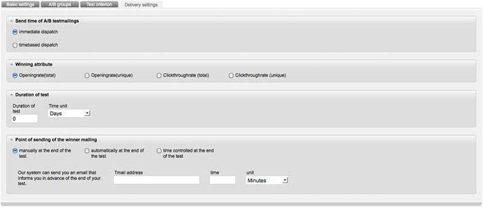 In the last tab you define the settings for the dispatch. Determine by which criterion (opening-rate or click-through-rate) Smartmail should identify the winner. Equally important is to determine the duration of the test.