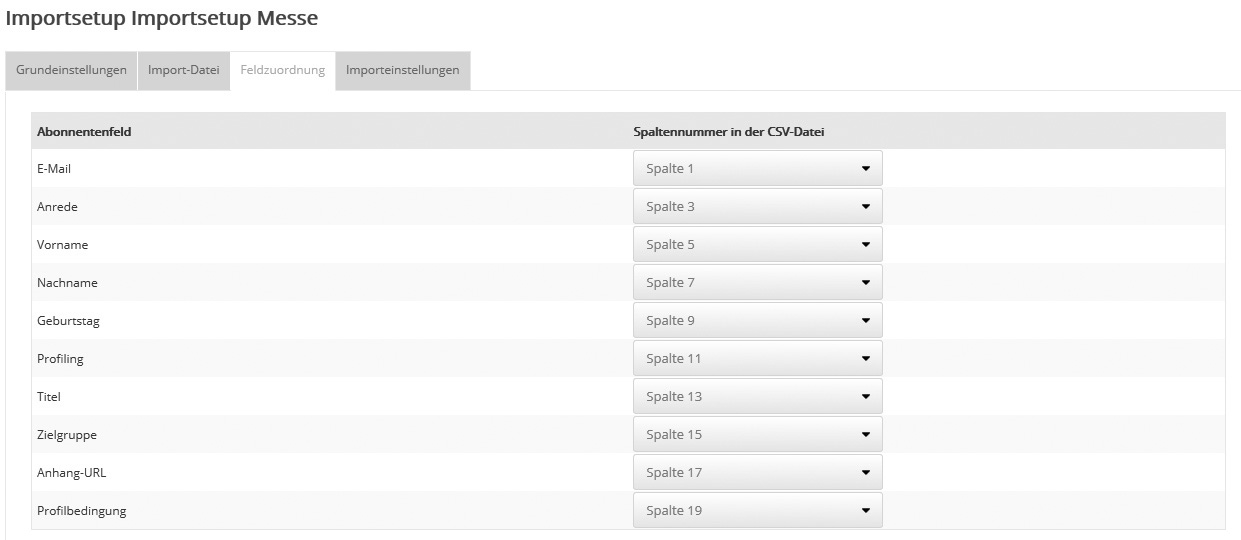 Im Reiter 'Feldzuordnung' teilen Sie mailingwork mit, welche Spalte (z.B. Vorname, Nachname) Ihrer CSV-Datei in welches mailingwork Abonnentenfeld importiert werden soll. Das geschieht, indem Sie die Abonnentenfelder auf der linken Seite durch Auswahl der richtigen Spaltennummer mit der passenden Spalte Ihrer CSV-Datei verknüpfen.Bitte beachten Sie dabei, dass die erste Spalte in Ihrer CSV-Datei dabei nicht der 'Spalte 0', sondern der 'Spalte 1' im Auswahlfeld entspricht. Hinweis: Bitte achten Sie darauf, dass die Spaltenzuordnungen angepasst werden müssen, wenn sich die Struktur Ihrer importierten CSV-Dateien ändert. Wenn die Spaltenzuordnung nicht vollkommen mit der Struktur Ihrer CSV-Datei übereinstimmt, werden - ähnlich wie beim automatisierten FTP-Abonnentenimport - die Felder der importierten Abonnenten mit den falschen Werten befüllt. Importeinstellungen