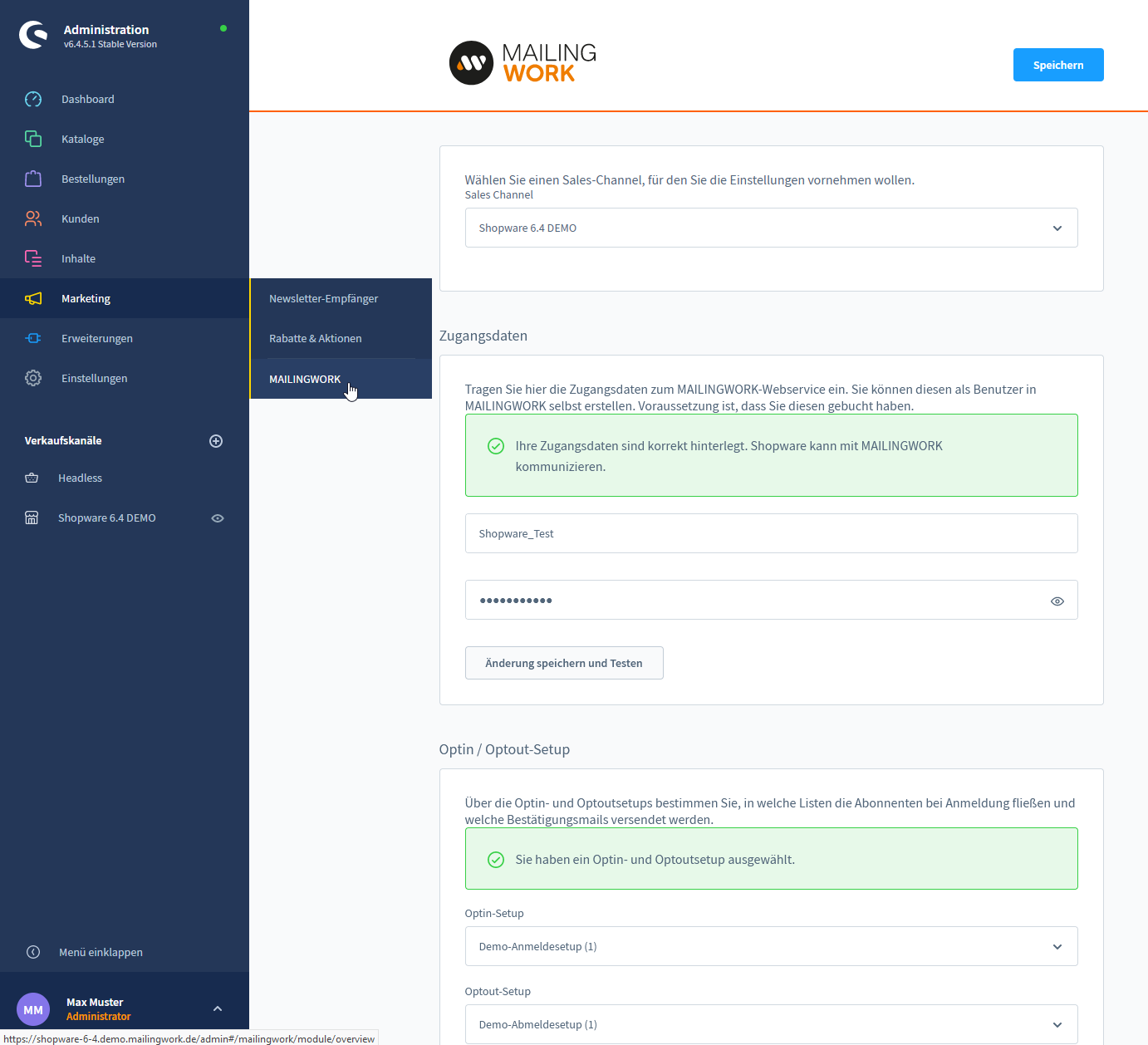 Loggen Sie sich im Admin-Bereich Ihres Shopware-Shops ein. Unter dem Reiter "Marketing ⭢ MAILINGWORK" finden Sie alle relevanten Einstellungen. Die Einstellungen treffen Sie jeweils pro SalesChannel.