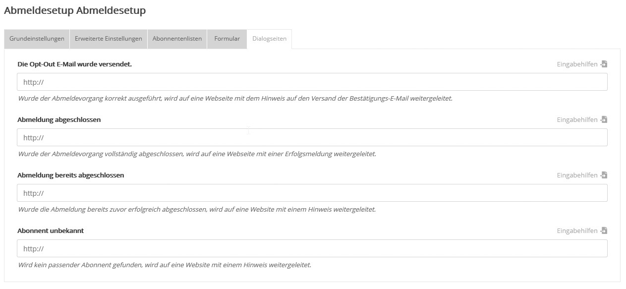 Zur Erklärung: Ein Abonnent wird nach erfolgreicher beziehungsweise fehlerhafter Eingabe seiner Daten zu einer entsprechenden Antwort-Seite geleitet, um zum Beispiel die Meldung 'Ihre Anmeldung war erfolgreich' zu erhalten. Füllen Sie diese Felder nicht aus, werden Standard-Seiten von Smartmail verwendet. Möchten Sie aber eigene Seiten anzeigen lassen, geben Sie die URLs Ihrer Webseiten in den Feldern an. Alternativ bietet e-vendo AG die Erstellung von Dialogseiten auf Basis Ihres Corporate Designs an. |